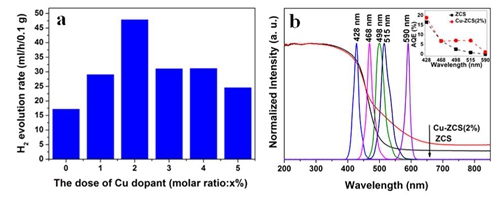 圖2.a)Cu摻雜及未摻雜Zn0.5Cd0.5S可見光催化分解水制氫性能比較 b)Cu(2%)摻雜未摻雜Zn0.5Cd0.5S在不同波長LED照射下的吸收性能及量子效率比較