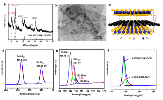 2納米片的堆積。 密度泛函理論計(jì)算揭示了夾層狀復(fù)合材料中間層間距最穩(wěn)定的狀態(tài)。分子模擬和實(shí)驗(yàn)觀測(cè)Li/Na離子的擴(kuò)散系數(shù)結(jié)果表明,該狀態(tài)最適合離子的快速傳輸。此外,固定在石墨烯片上的大量超級(jí)SnS
