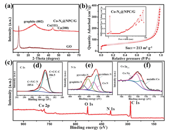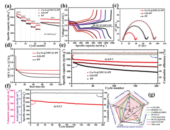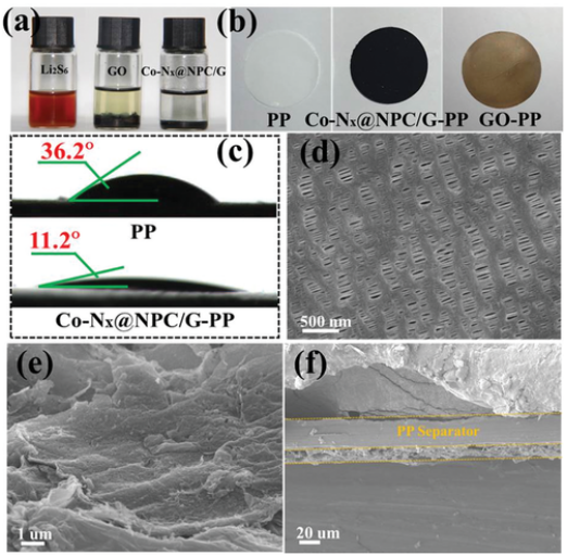 Figure 7.a) PP、GO-PP和Co-Nx@NPC/G-PP隔膜的聚硫化物滲透測量,顯示U型玻璃瓶中多硫化物從左側向右側擴散;b) Co-Nx@NPC/G-PP隔膜的電池結構示意圖,該隔膜對聚硫化物具有化學吸附和催化作用。 相關研究成果于2019年中國科學院福建物質結構研究所Ruihu Wang課題組,發表在Adv. Energy Mater.( https://doi.org/10.1002/aenm.201901609)上。原文:Separator Modified by Cobalt-Embedded Carbon Nanosheets Enabling Chemisorption and Catalytic Effects of Polysulfides for High-Energy-Density Lithium-Sulfur Batteries