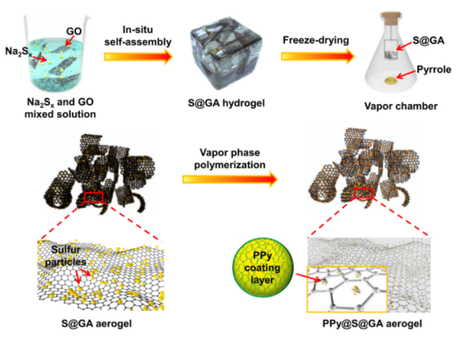 Scheme 1. PPy@S@GA復合材料合成工藝的三個步驟示意圖:(I)原位自組裝工藝獲得3D多孔石墨烯水凝膠包覆硫前驅(qū)體,(II)冷凍干燥前驅(qū)體,(III)VPP法使吡咯單體覆在S@GA氣凝膠表面。