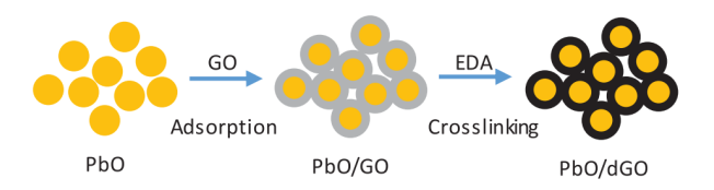 Figure 1. 通過將GO吸附到PbO上,然后用EDA處理來合成PbO/dGO的示意圖。