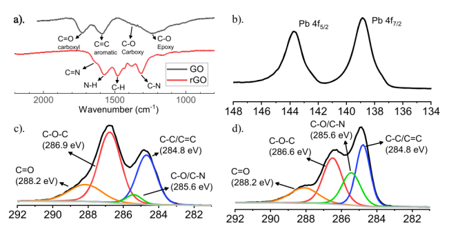 Figure 3. (a)GO和dGO(不含PbO)的FTIR光譜圖;(b)Pb 4f的XPS分析;(c)GO和(d)dGO在C 1s區域的XPS分析。