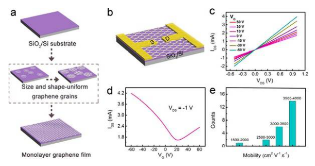 Figure 4. (a)石墨烯薄膜生長示意圖。(b)基于石墨烯的FET器件的原理結構。(c)室溫空氣中裝置的輸出曲線;(d)器件在VDS = -1 V時的輸出曲線;(e) 23個設備的載流子遷移率分布,主要為3500-4000 cm