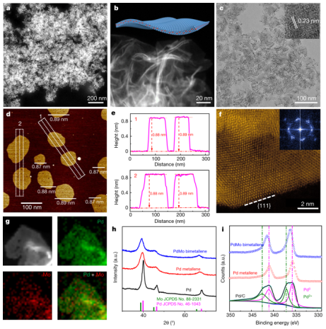 Fig. 1:PdMo雙金屬烯的形貌、結(jié)構(gòu)和組成表征。PdMo雙金屬烯的(a)低倍HAADF-STEM,(b)高倍HAADF-STEM和(c) TEM 圖。PdMo雙金屬烯的(d)AFM圖和(e)相應(yīng)的高度剖面圖。(f)單片雙金屬烯納米薄片的高分辨率HAADF-STEM圖。工業(yè)Pd/C、Pd金屬烯和PdMo雙金屬烯催化劑的(h)PXRD圖譜和(i)XPS譜。