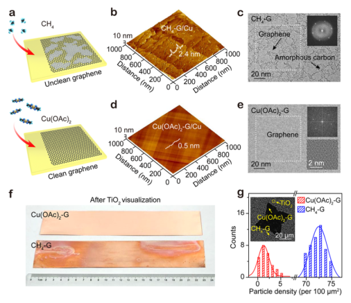 Figure 1. Cu(OAc)2衍生的石墨烯的清潔度得到提高:(a)比較Cu(OAc)2-和CH4-衍生的石墨烯的清潔度;不透明石墨烯的(b)AFM和(c)TEM圖像;(c)的插圖:(c)中正方形區域的FFT模式;使用Cu(OAc)2作為碳源獲得的干凈石墨烯的(d)AFM和(e)TEM圖像;(e)的插圖:相應TEM圖像的FFT模式(頂部)和HRTEM圖像(底部);(f)使用TiCl4蒸發進行TiO2可視化后,由Cu(OAc)2(頂部)和CH4(底部)生長的大面積石墨烯薄膜的照片;(g)清潔(紅色)和不清潔(藍色)石墨烯上TiO2納米顆粒的密度;插圖:依次使用Cu(OAc)2和CH4生長石墨烯的SEM圖像。