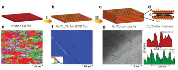 Figure 1 CVD法石墨烯制備Gr/Cu復合材料。a-c)多層復合材料的堆積方法。d) Cu/Gr層/Cu界面結構示意圖。e,f)石墨烯沉積前后Cu箔的EBSD圖。g) Cu/Gr/Cu界面的TEM圖。