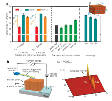 人們迫切需要高效率的導體,因為它們能在廣泛的應用中帶來更高的工作性能和更少的能源消耗。然而,傳統導體的導電性能的改善是有限的,如金屬的提純和單晶生長。這里,通過在金屬(銅、鋁、銀)中嵌入石墨烯,克服了石墨烯中載流子遷移率與載流子密度之間的權衡,通過精細的界面設計和形態控制,同時實現高的電子遷移率與高的電子密度。因此,在這種嵌有石墨烯的材料中,最高導電率比記錄的最高導電率高出三個數量級(Cu高出3000多倍)。使用石墨烯作為增強材料,在極低體積石墨烯含量(體積分數僅為0.008%)的石墨烯/Cu復合材料中,其電導率高達國際退火銅標準的117%,明顯高于Ag的電導率。該研究結果對于提高金屬在電氣和電子中的應用效率和節能具有重要意義,并且對于石墨烯中電子行為的基礎研究也具有重要意義。