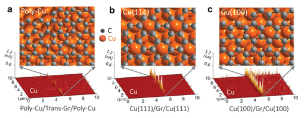 Figure 3不同基質Gr/Cu復合材料中沿界面區域的電流流動:a)多晶Cu,b) Cu(111)單晶和c) Cu(100)單晶。
