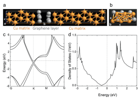 Figure 5第一原理計算。a,b) Cu/雙層-Gr/Cu復合材料的模型系統。c)電子頻帶結構。d)摻雜石墨烯的狀態密度。