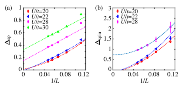 FIG. 3. (a)1/L外推單粒子間隙Δsp(K),該間隙在U/t=22和U/t=28之間。(b)自旋間隙的1/L外推量Δspin(K),自旋間隙與單粒子間隙同時打開,作為pVBS階的建立。