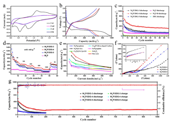 Figure 3.(a)Ni2P/3DG-4的前四圈CV曲線,(b)充放電曲線,(c)循環性能,(d)倍率性能,(e)與其他過渡金屬磷化物的倍率性能比較,(f)在循環測試后不同樣品的EIS譜,(g)長時間的循環性能。