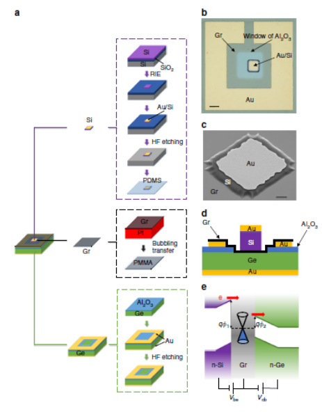 Figure 1.裝置的設計與構造。(a)直接堆疊Si膜,單層石墨烯和Ge基底建造Si-Gr-Ge晶體管,(b)光學照片,(c)Si膜在石墨烯上的SEM圖,(d)晶體管的橫截面示意圖。