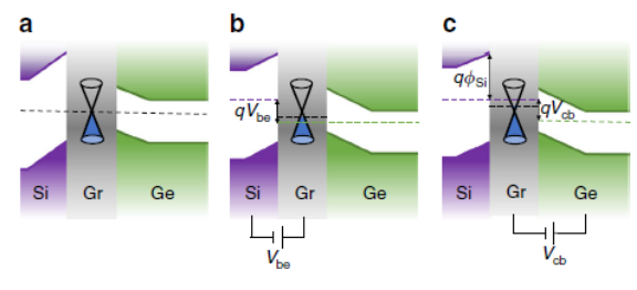Figure 4. Si-Gr-Ge晶體管的能帶圖。(a)無施加偏壓下的能帶圖,(b)給發射結施加一個大于零的正向偏壓時的能帶圖,(c)給集流體結施加一個大于零的反向偏壓時的能帶圖。?