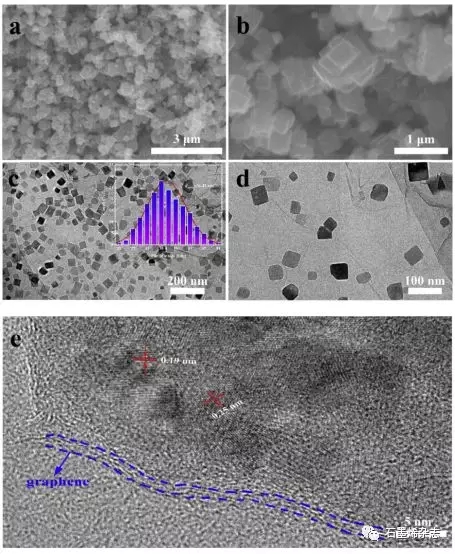 Figure 2. (a,b)NiFe2O4納米立方體的SEM圖像;NiFe2O4@rGO的(c,d)TEM和(e)HRTEM圖,c的插圖是NiFe2O4@rGO的粒度分布。