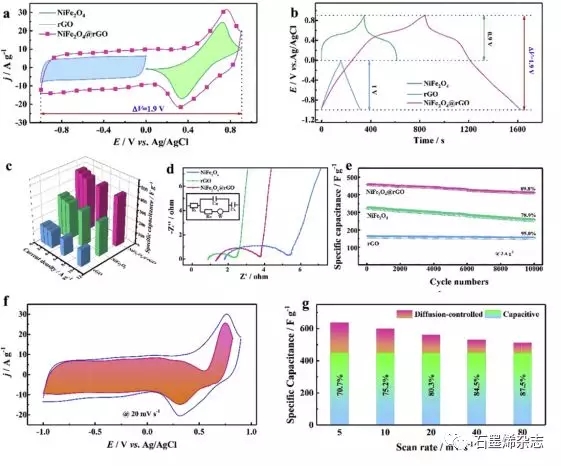 Figure 3. 在三電極系統(tǒng)中NiFe2O4、rGO和NiFe2O4@rGO的電化學(xué)性能:(a)CV曲線;(b)GCD曲線;(c)作為電流密度函數(shù)的比電容;(d)奈奎斯特圖;(e)10,000次循環(huán)的循環(huán)穩(wěn)定性;(f)以20 mV/s的恒定掃描速率分離NiFe2O4@rGO中的電容和擴(kuò)散電流;(g)電容和擴(kuò)散控制電荷對掃描速率的貢獻(xiàn)率。