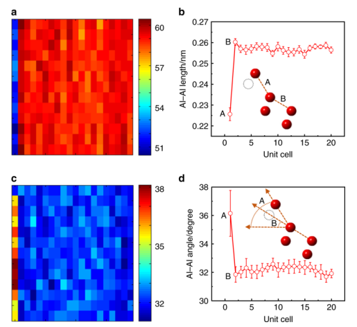 Fig. 3 Al-Al長度和角度的定量測量。(a) Al-Al長度映射。(b)平均距離。(c) Al-Al角度映射。(d)平均角度。