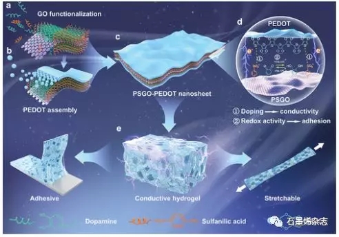 Figure 1 親水性,導電性和氧化還原活性的三明治狀PSGO-PEDOT納米片的示意圖及其在水凝膠中的結合。