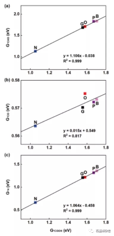 Figure 3. *CHO,(b)*CO,(c)*H結合自由能與*COOH結合自由能的線性比例關系。