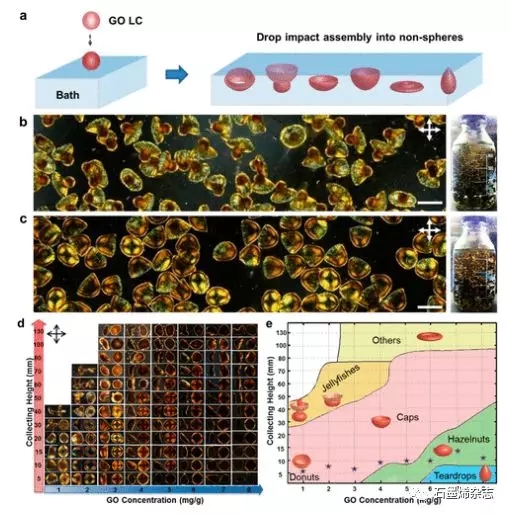 Figure 1. DIA組裝GO LC結構。(a)滴落撞擊組裝法示意圖。DIA制備的(b)水母狀和(c)榛果狀液晶組裝體照片。(d)在不同高度和濃度下得到的液晶組裝體形貌照片。(e)根據(d)繪制的GO制備相圖。