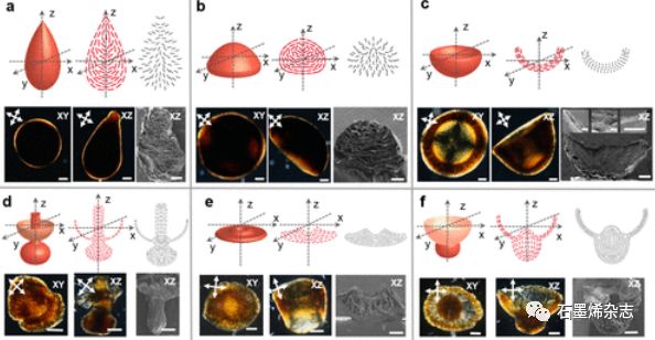 Figure 2. DIA制備的不同形狀的 GO LC:(a)淚滴狀;(b)榛果狀;(c)碗狀;(d, f) 水母狀,(e)向日葵狀。