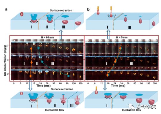 Figure 4. GO濃度的影響。從(a)60 mm和(b)5 mm高度撞擊過程的GO高速圖像和滴落過程示意圖。
