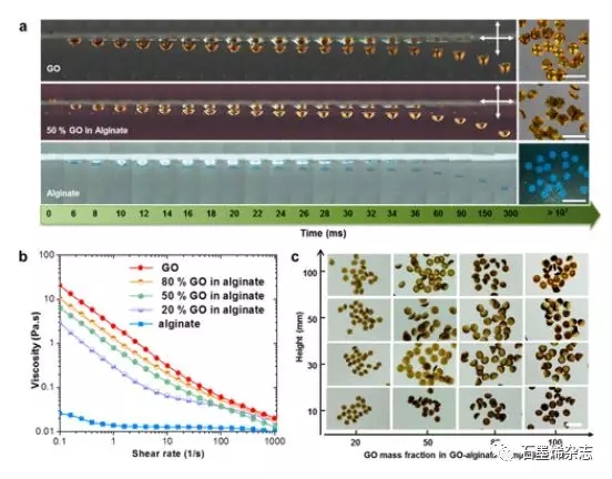 Figure 5. GO和藻酸鹽的不同成形能力。(a)GO,GO-藻酸鹽混合物和藻酸鹽的高速成像和POM圖。(b)穩定的剪切粘度和(c)不同GO質量分數和高度的GO-藻酸鹽復合材料的光學圖像。