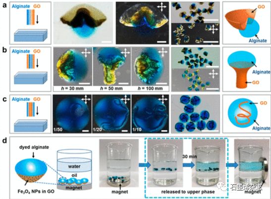 Figure 6. 各向異性復合液晶組裝體。(a-c)不同排列方式的GO-海藻酸鹽復合組裝體。(d)具有磁性的異形復合組裝體。