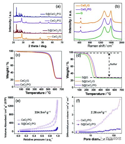 Fig. 4 CeO2/PG、S@CeO2/G復合材料與對比樣品的表征。(a)XRD圖譜,(b)Raman圖譜,(c, d) 對樣品進行熱重分析,確定氧化鈰和硫含量,(e, f) S@CeO2/PG和CeO2/PG的N2吸附-解吸等溫線和孔徑分布圖。