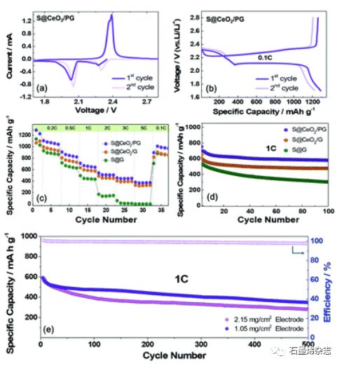 Fig. 6 S@CeO2/PG電極的電化學性能。(a) S@CeO2/PG電極的CV圖(0.1C,1.7-2.8V),(b) 0.1 C時S@CeO2/PG電極的充放電曲線,(c)不同電流密度下S@CeO2/PG、S@CeO2/G、S@G電極的倍率性能,(d) S@CeO2/PG、S@CeO2/G、S@G電極在1C下的循環穩定性,(e)1C下不同負載量的S@CeO2/PG電極的循環性能和庫侖效率。