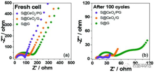 Fig. 8 電化學阻抗譜圖。(a)初始電池和(b)循環100次后的 S@CeO2/PG、S@CeO2/G、S@G電極的EIS圖。