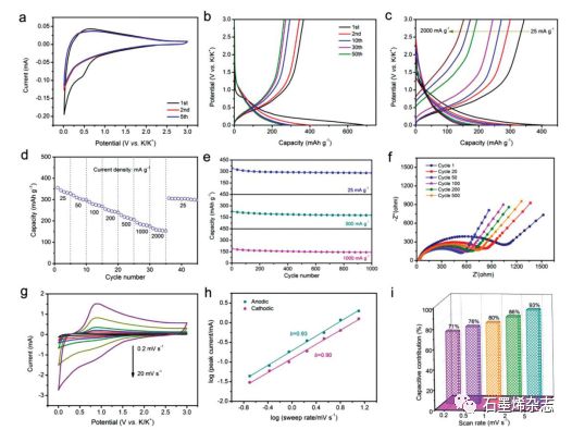 Figure 3.N, P-VG@CC作為KIBs陽極在半電池中的電化學性能。a)CV曲線;b)不同循環次數及c)不同倍率的的恒電流充放電曲線;不同電流密度下的d)倍率性能和e)循環性能;f) Nyquist 圖;g)不同掃描速率的CV曲線; h) 根據(g)中的CV曲線計算的峰值電流與掃描速率曲線圖;i)不同掃描速率下表面驅動力。
