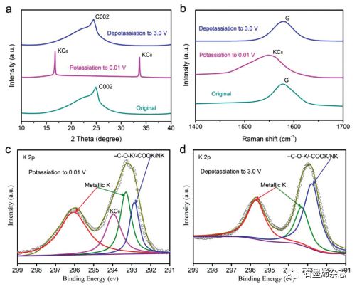 Figure 4. a) N,P-VG@CC電極在原始、嵌鉀和脫鉀狀態下的a)XRD和b)Raman 圖譜。c)嵌鉀完全和d)脫鉀完全的XPS譜。