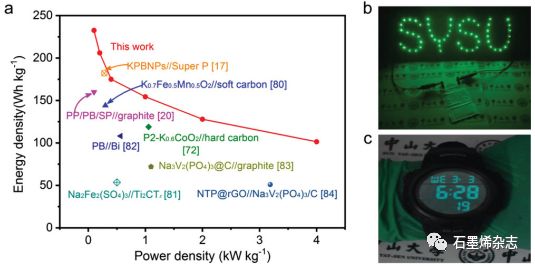 Figure 6.a)基于不同活性材料柔性KPB//N、P-VG@CC全電池的Ragone圖;KPB//N, P-VG@CC全電池提供電源的b)霓虹燈和c)手表。