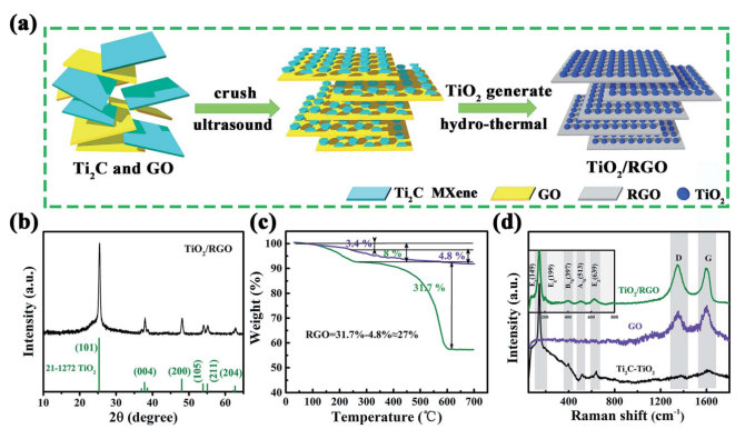 2/RGO復合材料的(b)XRD和(c)TG;(d)TiO