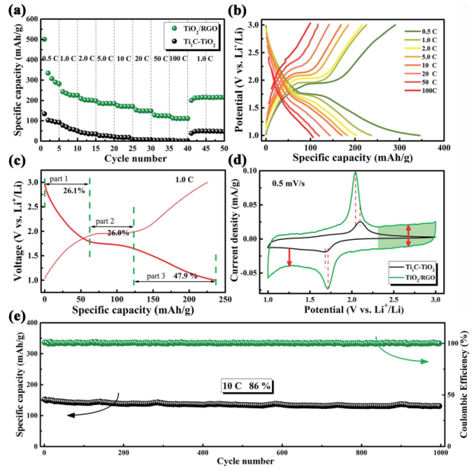 2/RGO在(b)不同速率和(c)1C速率下的充放電曲線;(d)TiO