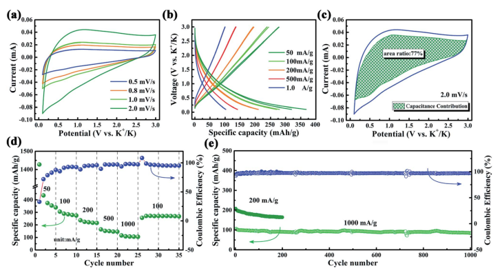 2/RGO作為陽極材料,對Li離子和K離子電池均具有高容量,顯著的倍率能力和長循環(huán)性能。優(yōu)異的電化學性能歸因于小粒徑(15–25 nm)和RGO提供的電子傳輸通道,以及離子擴散路徑短。此外,RGO激勵了電容性貢獻,從而提高了容量并改善了倍率性能。同時,通過定量動力學分析研究了Li/K離子存儲的電化學動力學。這項工作證明了引入電容容量以實現(xiàn)快速離子存儲并改善循環(huán)穩(wěn)定性的可能性,為設計用于金屬離子電池的高效電極提供了新策略。