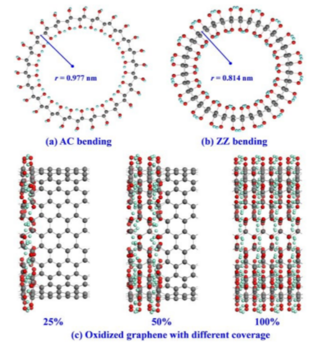 Fig. 1 氧化石墨烯納米管模擬的氧化石墨烯沿(a) AC和(b) ZZ彎曲方向的彎曲行為,(c)不同覆蓋率的III型氧化石墨烯的彎曲行為。