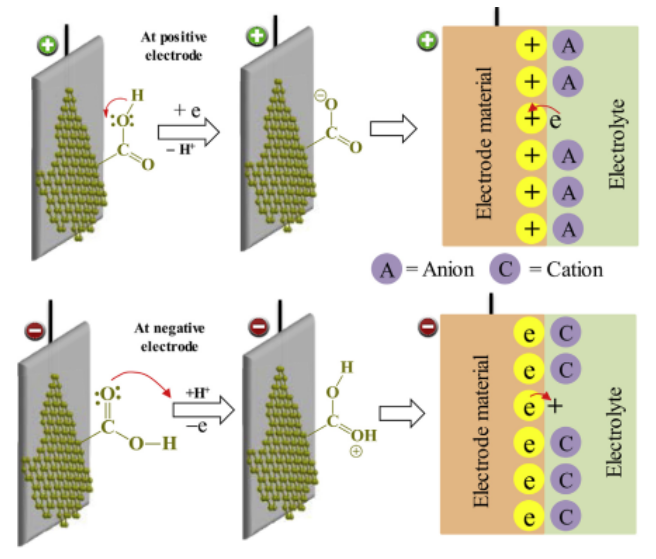 Figure 5. ECG中含氧羧基官能團在可逆贗電容反應中的工作機制。