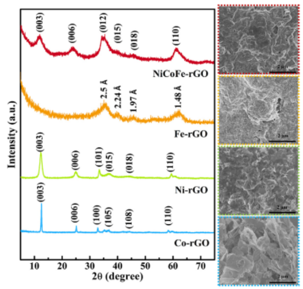 Figure 2. Co-rGO, Ni-rGO, Fe-rGO, 和NiCoFe-rGO的XRD和SEM圖。