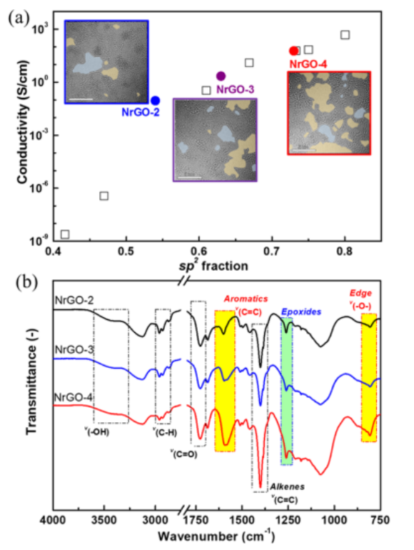 Figure 1. NrGO催化劑的物理和化學表征。(a)實心圓圈代表NrGO薄膜(50 nm)的電導率(橫坐標為C-sp2占總碳原子數(shù)的百分比),白色方框為rGO三層薄膜的電導率,(b)三種NrGO催化劑的IR譜比較。