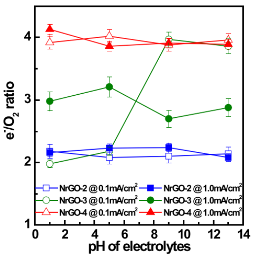 Figure 2. 三種NrGO催化劑的電子轉(zhuǎn)移數(shù)(e-/O2)作為pH的函數(shù)關系(在低過電位和高電位情況下)。