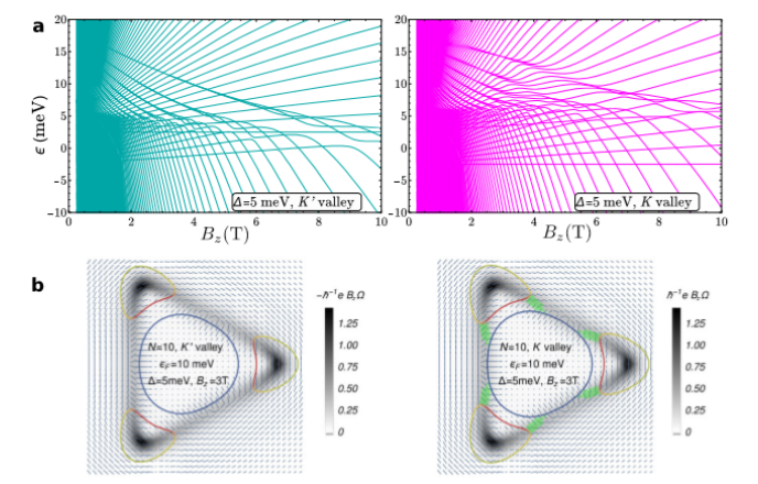 Fig. 7 a Landau能級(jí)譜是在Δ=5meV時(shí)垂直磁場(chǎng)Bz的函數(shù)。b 對(duì)于在K’/K處的Δ=5meV,繪制了B