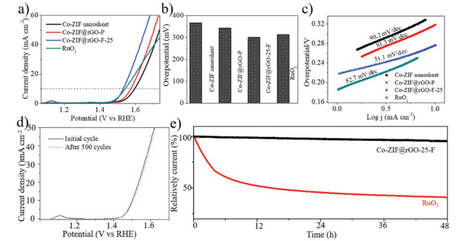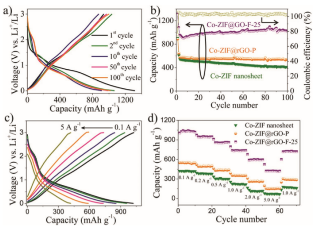 Figure 4. a) Co-ZIF@rGO-F-25在電流密度0.1 A g−1時恒流充放電曲線;b) Co-ZIF納米片、Co-ZIF@rGO-P、Co-ZIF@rGO-F-25在0.1 A g−1電流密度下的循環性能;c) Co-ZIF@rGO-F-25在不同電流密度下的恒電流充放電曲線;d) Co-ZIF納米片,Co-ZIF@rGO-P,Co-ZIF@rGO-F-25的倍率性能。