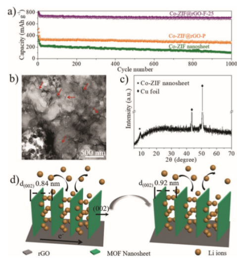 Figure 5. a) Co-ZIF納米片,Co-ZIF@rGO-P, Co-ZIF@rGO-F-25在較高電流密度為1 A g−1時的長期循環性能;循環測試后Co-ZIF@rGO-F-25負極的b) TEM圖像,c) XRD譜; d) Co-ZIF @rGO-F-25中Co-ZIF納米片的平面間距的示意圖。