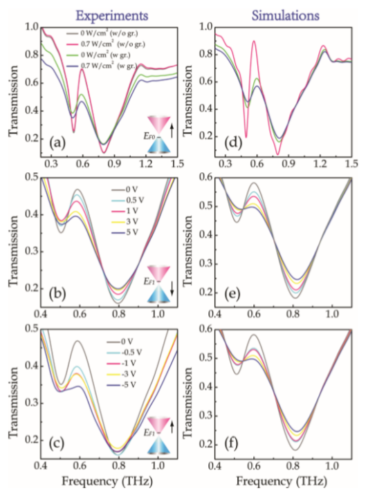 -2光泵下Gr-TASR器件的a)測量傳輸和d)的模擬傳輸。在0.7 W cm