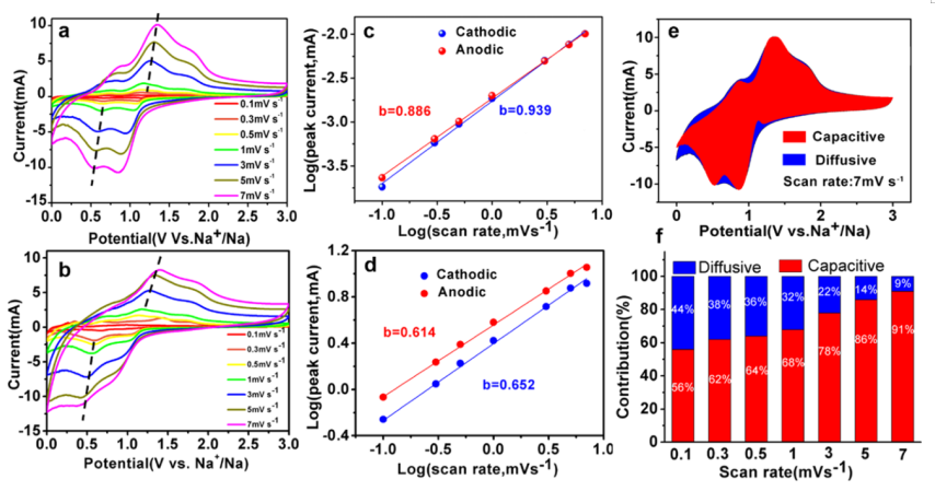 Figure 5.不同掃描速率下,SIB中(a)SnS/rGO和(b)SnS負極的CV曲線;(c,d)分別由SnS/rGO和SnS的log i和logυ擬合的b值;(e)在7 mV/s時,SnS/rGO的電容性和擴散性貢獻;(f)SnS/rGO電容貢獻的百分比