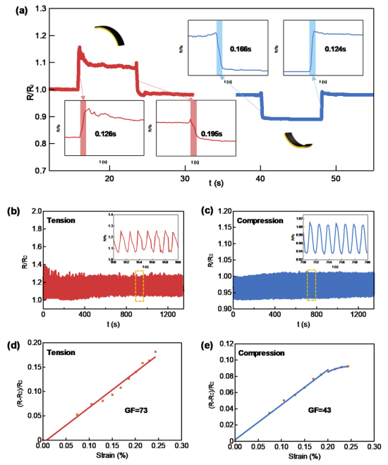 Figure 3. 拉伸/壓縮應變傳感結果的性能:(a)原型傳感器分別在拉伸和壓縮應變下的響應時間和恢復時間;(b)在0.24%拉伸應變下,MCG復合材料進行1000次循環的穩定性測試;插圖:放大波形;(c)MCG復合材料于0.15%壓縮應變下進行1000次循環的穩定性測試;插圖放大波形;(d)拉伸應變和(e)壓縮應變的應變系數測量