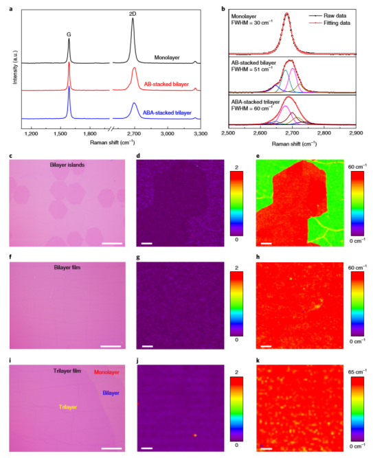 至今尚未報道大于1厘米的高質量AB堆疊雙層或多層石墨烯。在此,我們報道了用可控濃度的Ni制造和使用單晶Cu/Ni(111)合金箔,通過化學氣相沉積的方法生生長大面積,高質量AB堆疊雙層和ABA堆疊三層石墨烯薄膜。通過拉曼光譜和透射電鏡(包括選定的區域電子衍射和原子分辨率成像)對石墨烯薄膜的堆積順序、覆蓋范圍和均勻性進行了評估。電遷移(載流子遷移率和帶隙可調性)和熱導率(雙層石墨烯的熱導率值約為2,300 W m