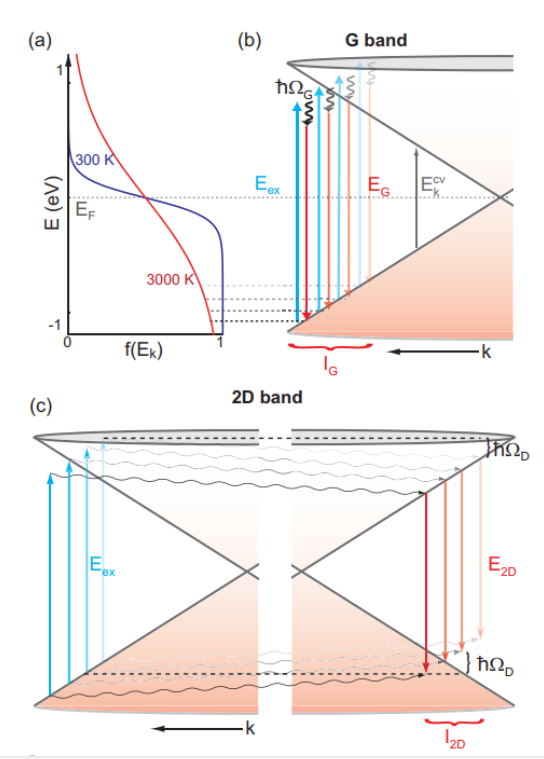 Figure 3.(a)在低(300 K)和高(3000 K)電子溫度下,電子的費米-狄拉克分布。 (b,c)能級方案分別說明了導致G和2D頻帶散射的過程。
