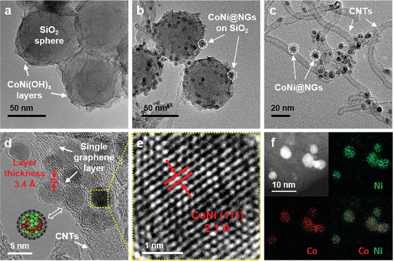 2的TEM圖像。(c–e)CoNi@NGs的HRTEM圖像。(d)紅色標記表示石墨烯層的厚度為3.4 Å;插圖:CoNi@NGs的模型結(jié)構(gòu)。(e)圖(d)的放大圖,CoNi合金的(111)晶面。(f)CoNi@NGs中Co和Ni元素的EDX圖。